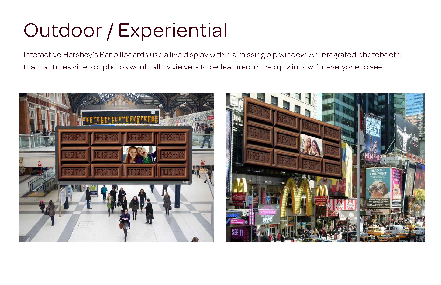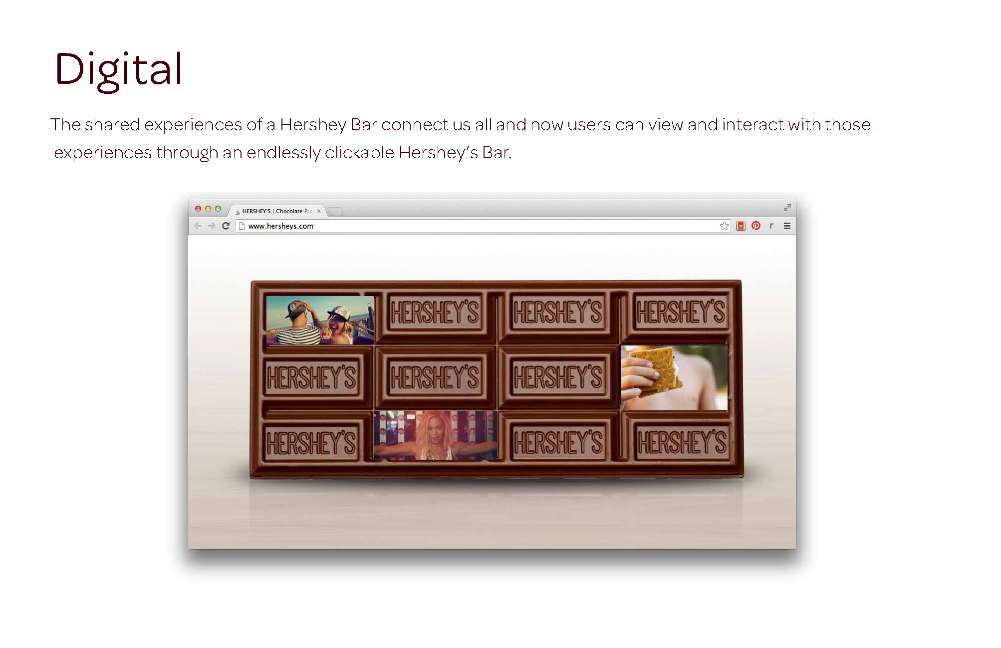 Humans are social creatures by nature—we all share a need to connect. Hershey’s has been creating shared experiences in our lives for over 100 years so the “Our Chocolate” campaign celebrates those delicious moments that connect us. The campaign launched with Hershey’s Bar and has extended to Cookies and Crème, Almond, Miniatures, Spreads and S’mores, across television, digital and experiential.