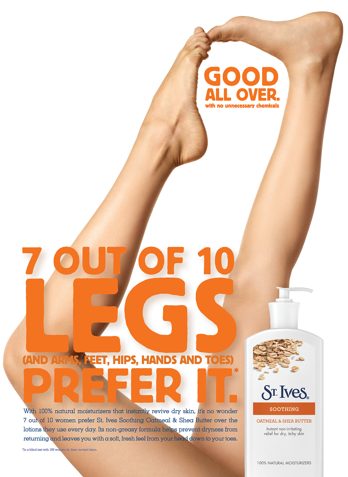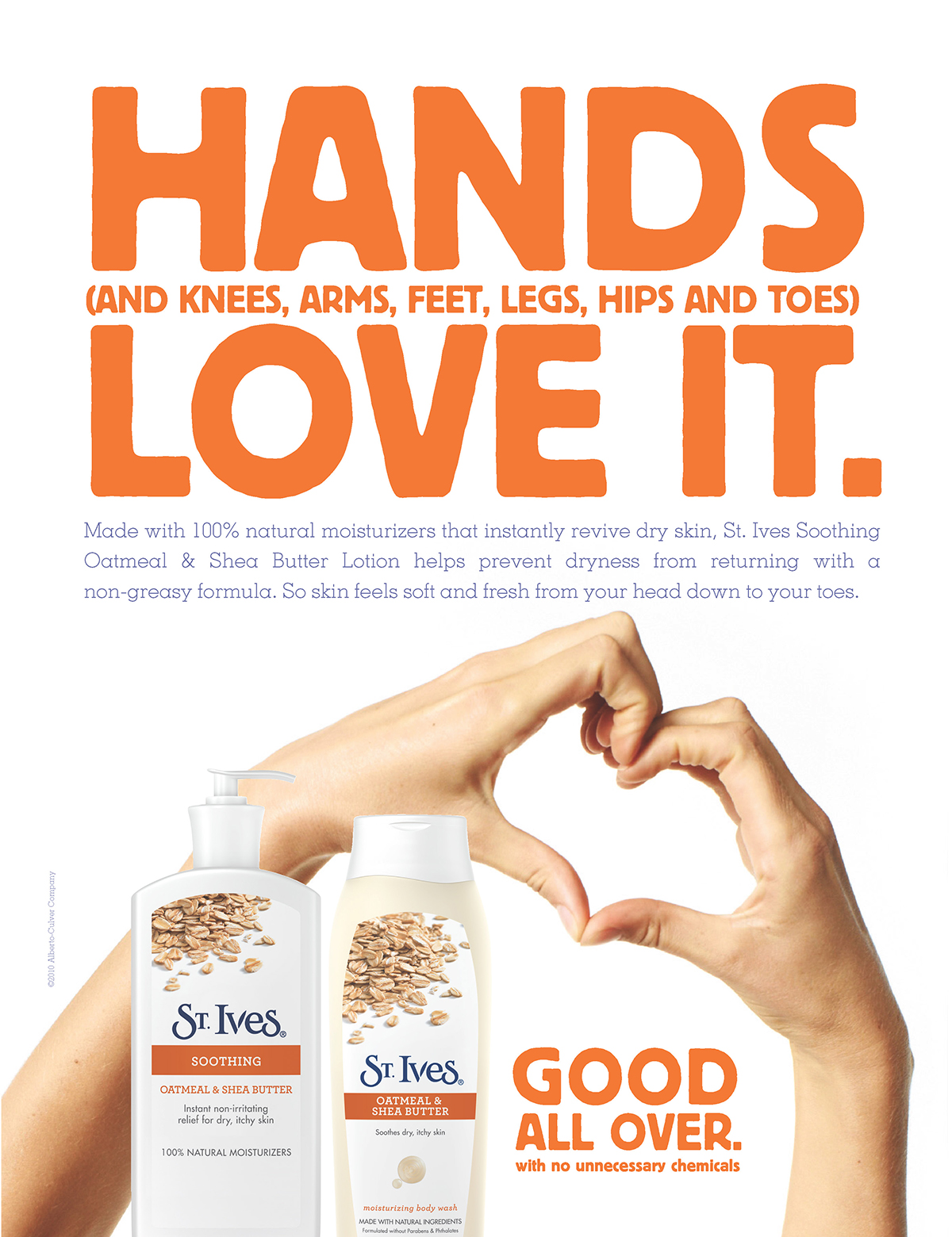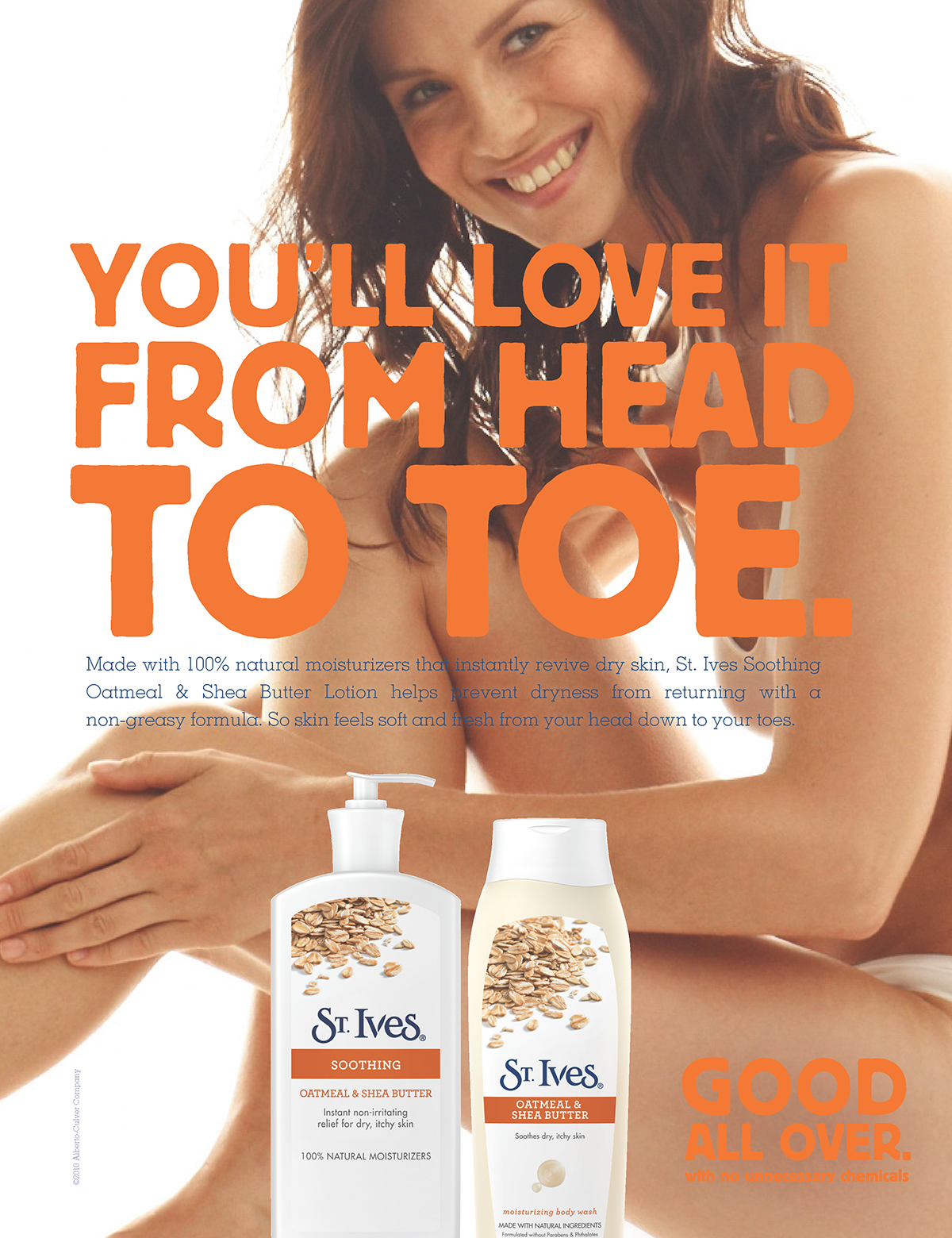 The St. Ives client conducted a study and discovered that 7 out of 10 women preferred St. Ives lotion to the lotions they use every day. They wanted a launch spot that brought this claim to life and the “Good All Over” campaign was born. An integrated campaign that extended to lotions, body washes and face scrubs and was supported by television, print, digital, iAds and promotions.